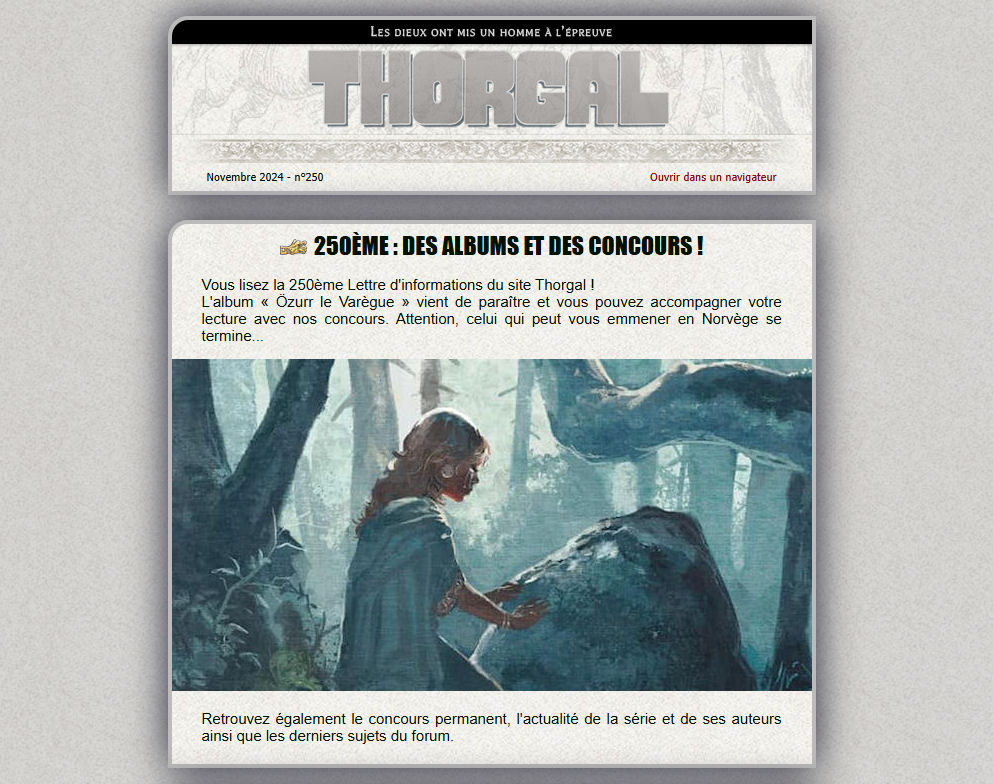 Nous venons de poster la 250ème Lettre d’informations du site Thorgal. Les abonnés ont ainsi pu recevoir à domicile les infos du mois, comme c’est le cas depuis… juillet 2005 ! Cet article vous propose de remonter le temps pour y retrouver quelques autres Lettres emblématiques, récoltées au fil des années. On commence avec la toute première Lettre, le 23 juillet 2005. L’ancien site Thorgal-BD était alors encore la référence. On y découvrait un tout nouveau jeu, Thorgal l’Européen, ainsi que la parution du 4ème tome de la première intégrale Niffle. A l’époque, toutes les réalisations signées Van Hamme ou Rosinski étaient aussi au programme, notamment la fameuse série XIII (chez Dargaud). La Lettre était habillée d’un parchemin un peu rugueux, héritier des premières époques du site. La 50ème Lettre d’informations arrive en juin 2009 avec également un nouveau jeu, les énigmes des généraux d’Ogotaï, ainsi que de nouvelles infos sur la série XIII (qui savait se placer au bon moment pour être dans la Lettre Thorgal ). Le parchemin s’était affiné et le logo avait changé, mais l’esprit de la Lettre restait le même. Elle était bimensuelle depuis 2008 et le resta jusqu’en 2010. On arrive en mars 2012 à la 100ème Lettre d’informations. Son nouveau format s’était adapté à la transformation majeure qu’avait connue le site Thorgal-BD, devenu plus professionnel et plus proche des auteurs et de l’éditeur. Elle affichait le dernier logo de Thorgal-BD mais conservait les fameuses couleurs qui ont fait sa légende . Les dernières parutions des Mondes de Thorgal étaient à l’honneur, ainsi que leurs auteurs Giulio de Vita, Yves Sente, Yann et Roman Surzhenko. Les actualités du mois y étaient toutes insérées, avec un temps de lecture conséquent, et les liens vers les derniers sujets du forum étaient également au programme depuis la mue de la Lettre en juillet 2011. La 150ème Lettre est postée en avril 2016  avec à l’affiche le tome 4 de La jeunesse de Thorgal et le tome 6 de Louve, ainsi qu’un fabuleux présentoir en métal réalisé pour les librairies les plus chanceuses. Le design de la Lettre est désormais calqué sur celui du nouveau site Thorgal.com qui a remplacé Thorgal-BD en octobre 2014. On vire donc au gris mais l’esprit est toujours là ! La 200ème Lettre débarque en juin 2020 avec une exclusivité, la toute première planche du tome 38 de Thorgal, réalisée par Fred Vignaux. Une planche magnifique pour une Lettre qui propose des concours et une masterclass de l’auteur. La Lettre ne reprend désormais plus l’entièreté des articles, elle propose à la place des liens semblables à ceux qui se trouvent en page d’accueil du site. Pour les lire, il faut cliquer ! Et voici donc la 250ème Lettre d’informations. Elle est toute fraîche et arrive au bon moment pour présenter les concours de fin d’année et le tome 42 de Thorgal. Elle a peu changé depuis 10 ans, avec simplement un ombrage qui n’apparaît certainement pas dans la plupart des messageries ! De la pure esbroufe, qu’on ne retrouve que dans la version qui peut être lue en ligne. Le cap est mis vers la 300ème Lettre qui devrait arriver en début d’année 2029. La passion Thorgal continue et se partage aussi ainsi.